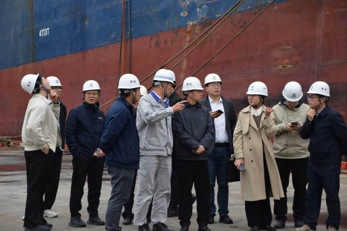 调研组实地考察了企业码头、船坞等生产一线,深入了解企业生产经营现状及修造主营业务。邬志祥围绕企业近年来生产经营成效、典型在修及改造项目、科技创新与数字化建设、重大工程推进等方面作了重点汇报,全面展示了企业在涉船领域取得的阶段性成果。